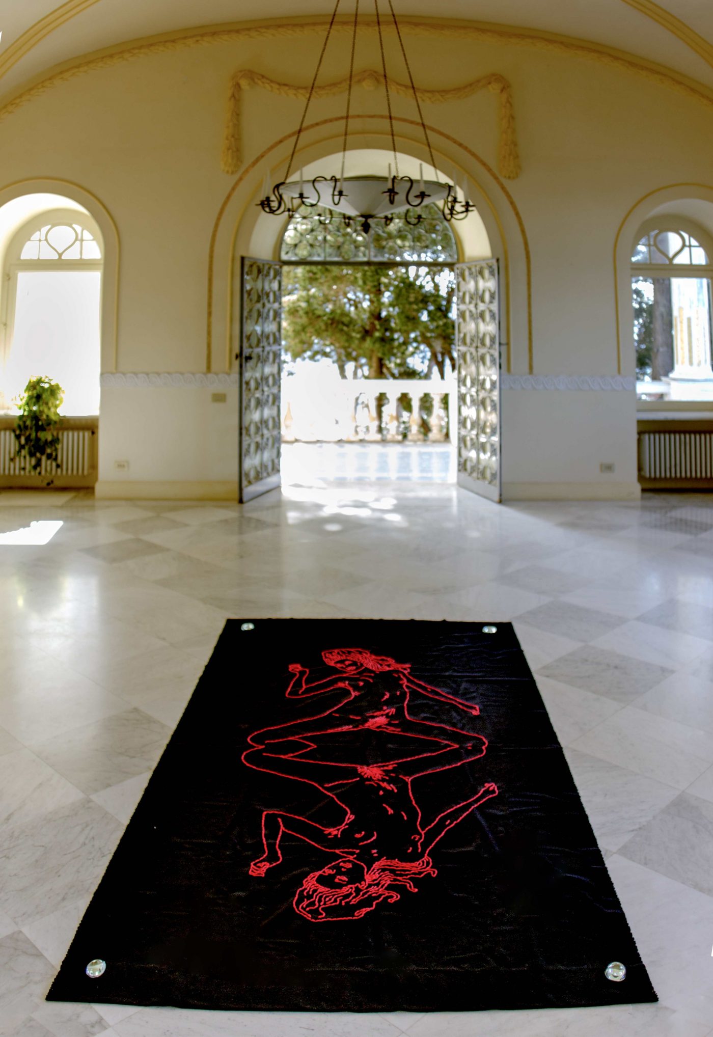 L’esposizione prevede l’allestimento inedito di sei opere finora chiuse nel “cassetto dei disegni” dell’artista: ad accogliere i visitatori, un grande ricamo siamese rosso su fondo nero, adagiato sul pavimento d’ingresso con 4 gocce di cristallo purissimo ai lati. Due lunghe ali a matita e carboncino su carta disposte, a specchio, sulle pareti delle stanze superiori; attorno, tre piccole raffigurazioni di voli sospesi tra Ganimede, Perseo e altri mitici viaggiatori fanno da contraltare. Un ultimo grande ricamo nel “fumoir”, o stanza dell’oppio, conclude il percorso.