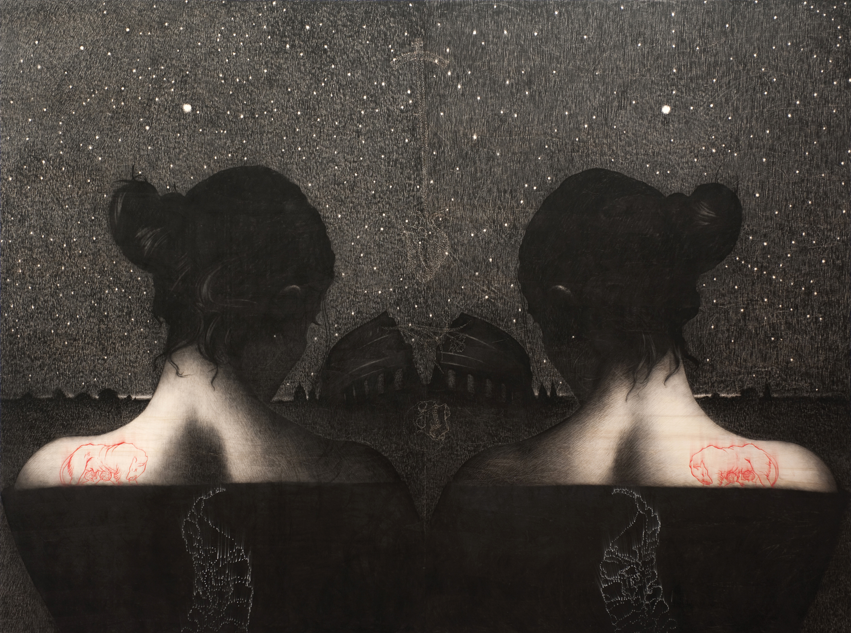 OMAR / ROMA / AMOR “, matita nera + pigmento su tavola di pioppo, cm 315×400, anno 2011/2012
