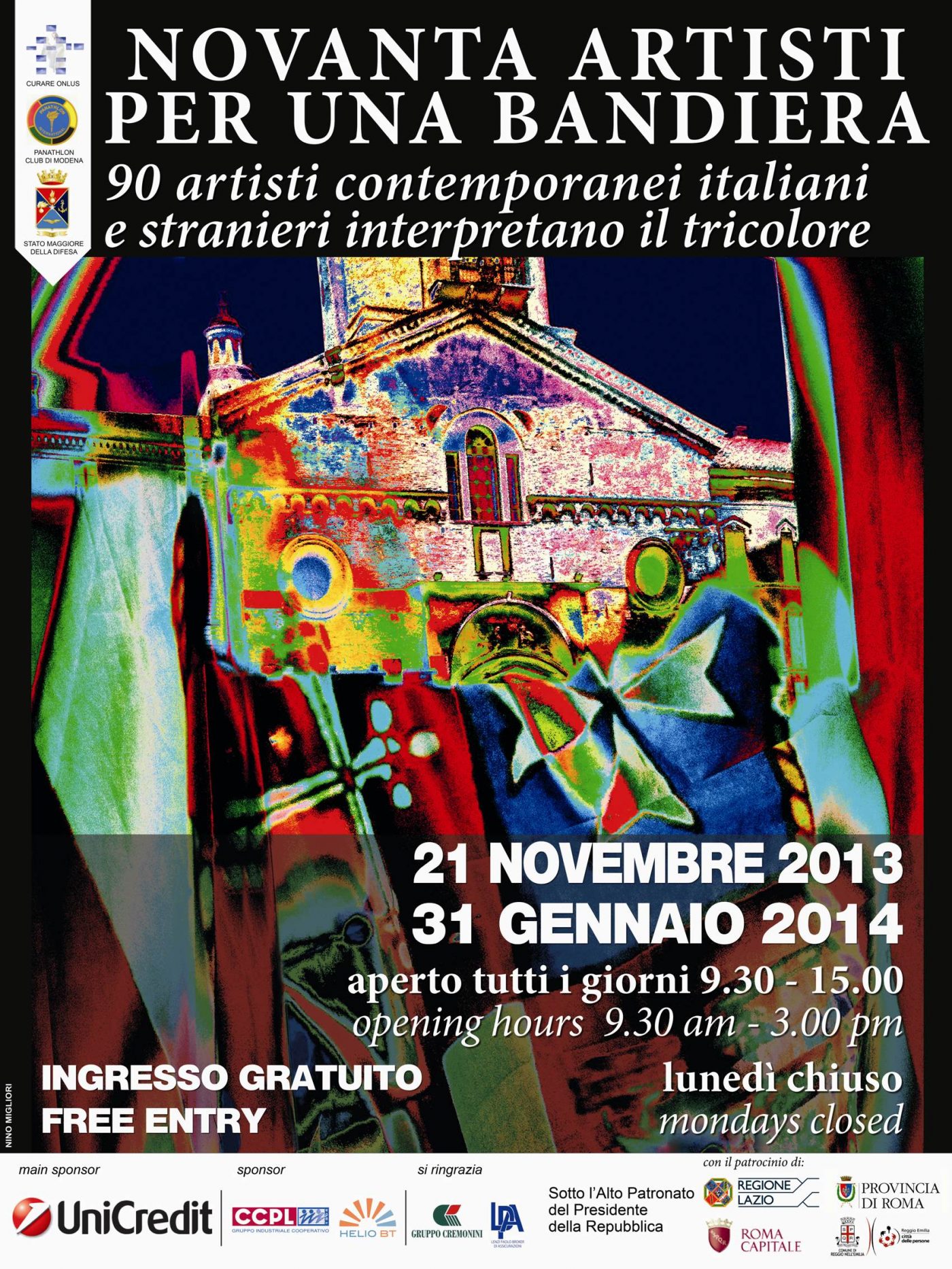 Si tratta della mostra NOVANTA ARTISTI PER UNA BANDIERA, sotto l’Alto Patronato del Presidente della Repubblica, promossa dall’Associazione CuraRE Onlus presieduta da Deanna Ferretti Veroni e da Panathlon Modena, in collaborazione con lo Stato Maggiore della Difesa e del Comune di Reggio Emilia, col patrocinio della Regione Lazio, della Provincia di Roma, del Comune di Roma.