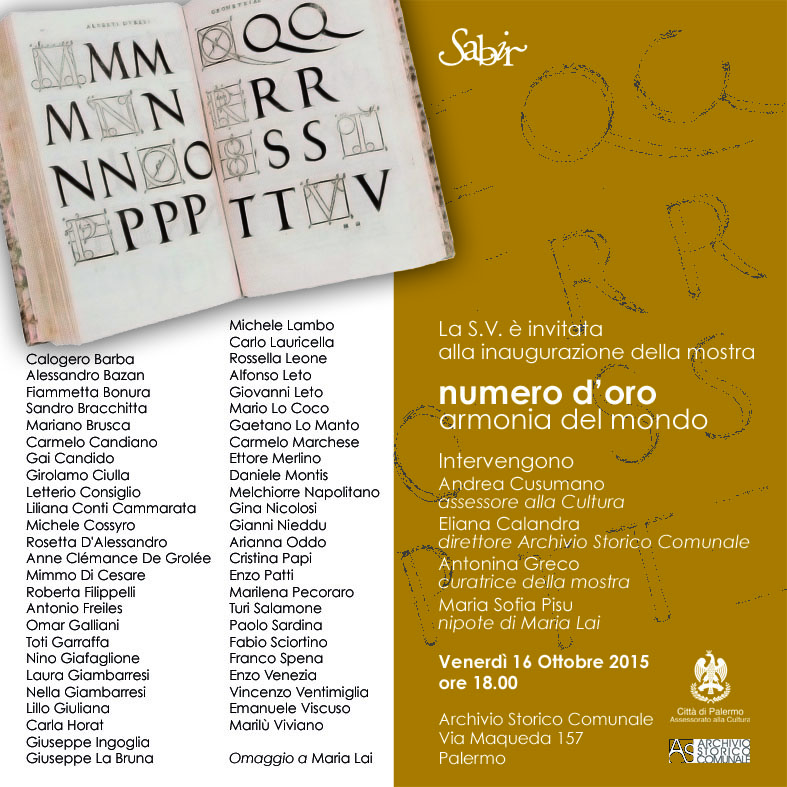Si inaugura venerdì 16 Ottobre, alle ore 18, all’Archivio Storico Comunale (Via Maqueda 157, Palermo) la mostra “Numero d’oro: armonia del mondo”, organizzata da Sabir srl e promossa dall’Assessorato comunale alla Cultura. Interverranno l’assessore alla cultura Andrea Cusumano, il direttore dell’Archivio Storico Comunale Eliana Calandra, la curatrice della mostra Antonina Greco e Maria Sofia Pisu, nipote dell’artista sarda Maria Lai.