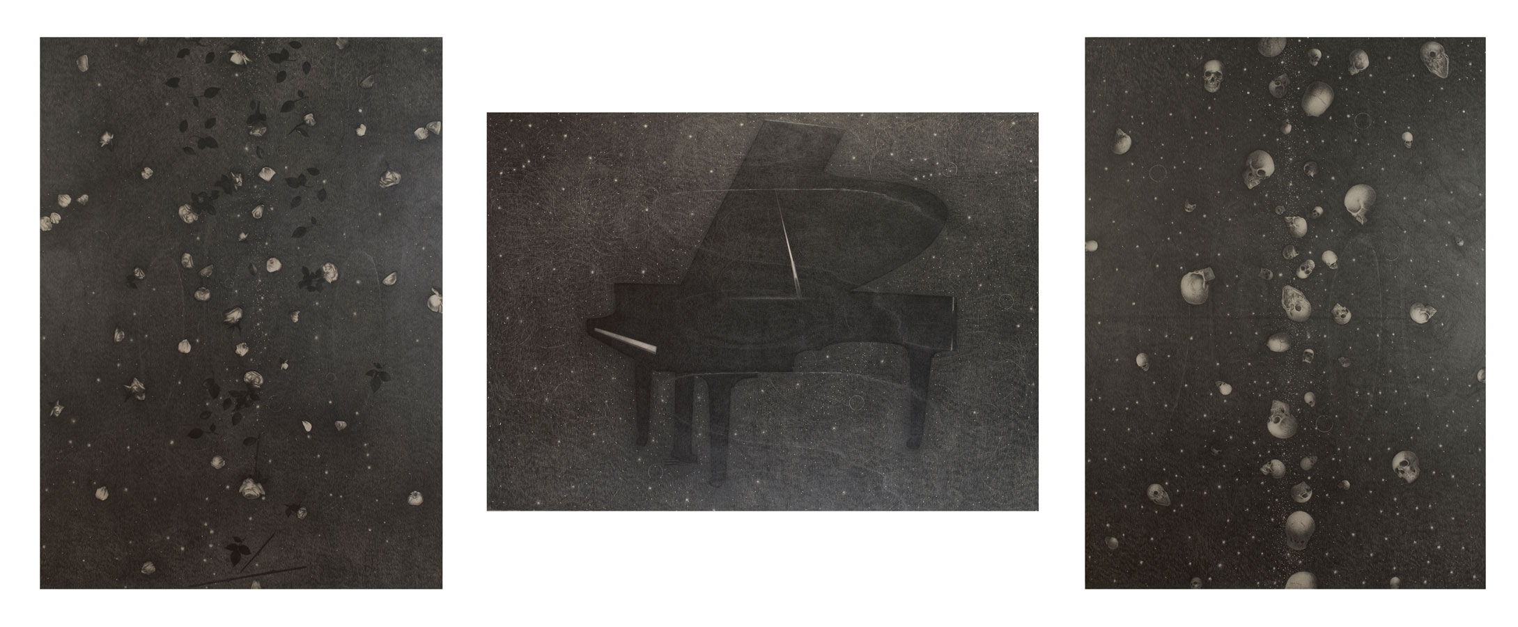 Un pianoforte sospeso nel cielo suona una caduta di rose e  teschi.  Melodia della vita e della morte. Porta della notte e del giorno si staglia nel cielo. Frammento cosmico, inizio e fine melodico dolce o doloroso della vita.