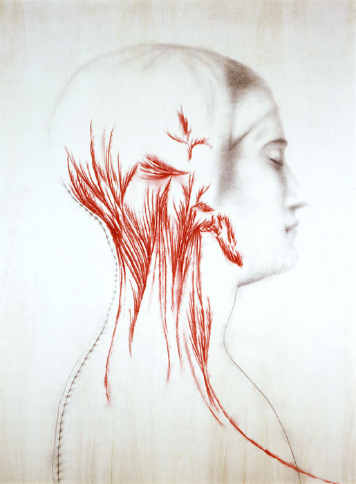 Volti , corpi, muscolarità, fisiognomiche di identità sognanti o lontane dal dolore mantengono la fisicità dell’anatomia reale per poi sconfinare nelle contaminazioni che dal cibo all’aria oggi mutano il nostro corpo, la nostra vascolarità non soltanto ma anche psicologica.
